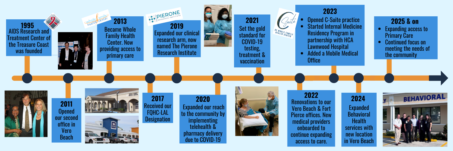 Whole Family Health Center (WFHC) has grown from a grassroots initiative into a leading nonprofit community health center on Florida’s Treasure Coast. Originally founded in Fort Pierce as the AIDS Research and Treatment Center of the Treasure Coast (ARTCTC), WFHC was established by Dr. Gerald Pierone, a board-certified Infectious Disease Specialist dedicated to addressing the HIV/AIDS epidemic in underserved communities.