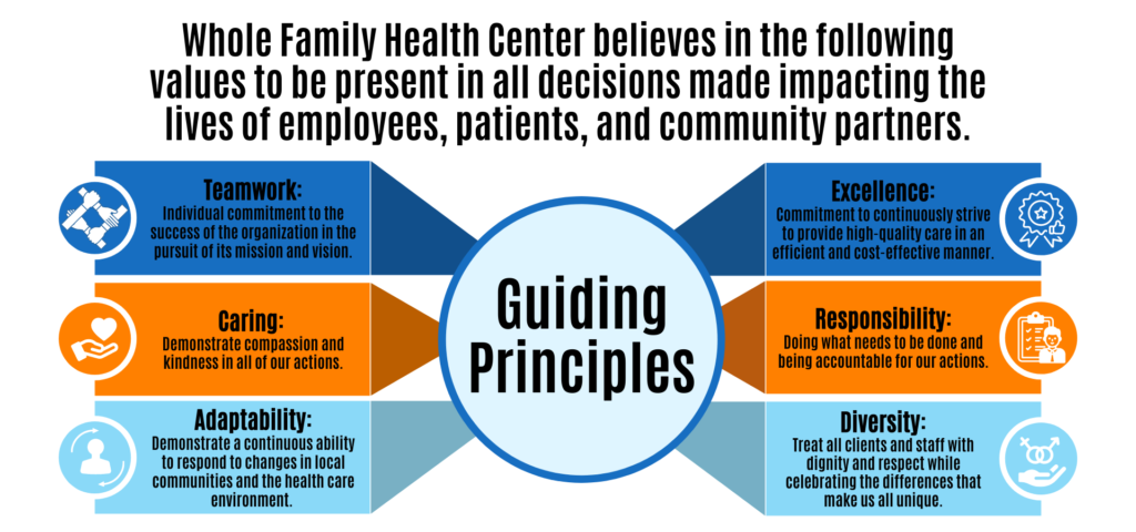Whole Family Health Center’s mission is to provide high-quality, caring, accessible health care services; adult and child, medical, mental, and oral health, to everyone.